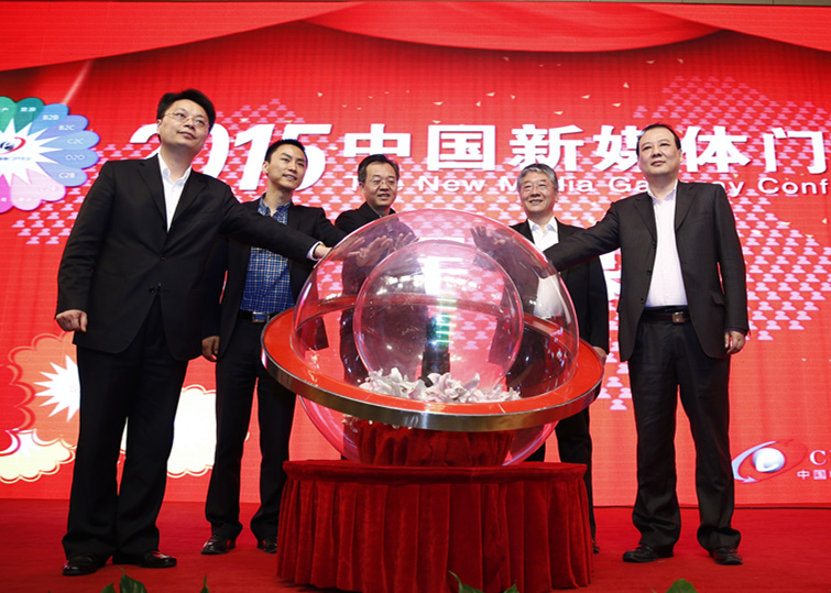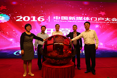第二屆中國(guó)新媒體門(mén)戶(hù)大會(huì)開(kāi)幕儀式上,中共中 央辦公廳信息中心副主任郭瑞明等領(lǐng)導(dǎo)啟動(dòng)開(kāi) 幕儀式